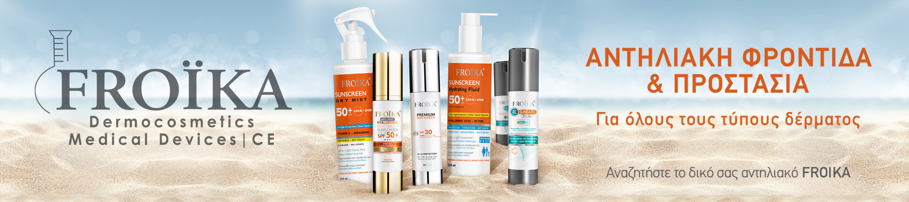Τα προϊόντα Sun Care SPF 50 της παρέχουν πολύ υψηλή φωτοπροστασία για καθημερινή χρήση σε συνθήκες ακραίας ηλιοφάνειας (ορεινά, θαλάσσια σπορ) όλη τη διάρκεια του έτους και ειδικά σε ευαίσθητες περιοχές, όπως η μύτη και τα αυτιά. Προτείνεται ειδικά για την προστασία ουλών και εγκαυμάτων. Δεν περιέχει paraben και προτείνεται για υπερευαίσθητα, μη ανεκτικά στον ήλιο δέρματα. Είναι διαθέσιμη σε μορφή κρέμας, γαλακτώματος και spray:- Froika Suncare Cream SPF 50+ / κανονικά & ξηρά δέρματα