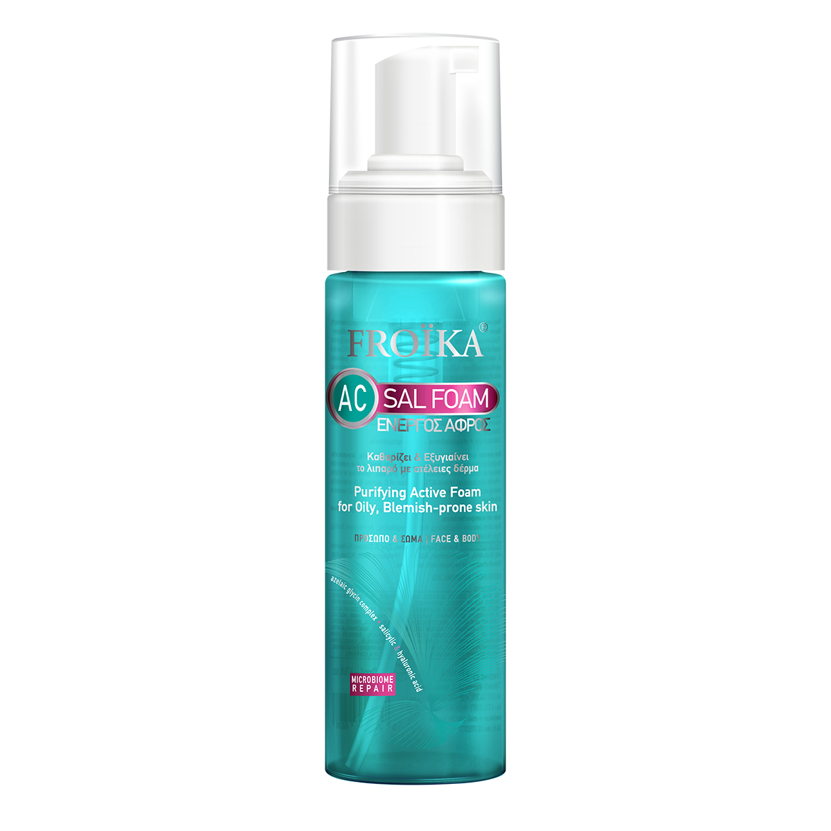 The AC Sal Foam acts as an anti-microbial barrier (microorganisms' reduction in the order of 47%, C. acnes & S. epidermidis). Restoration and enhancement of the skin's normal microbiome is achieved in the order of 42% in the disturbed skin.