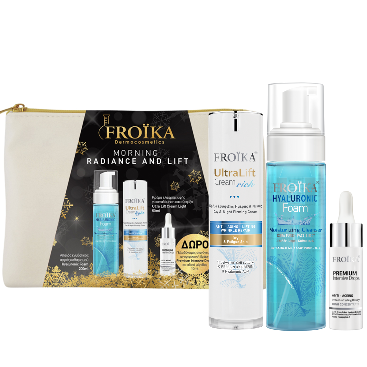 Το σετ περιποίησης Morning Radiance & Lift περιλαμβάνει κρέμα προσώπου Ultra Lift Cream Light  50 ml και αφρό καθαρισμού Hyaluronic Foam 200 ml για ολοκληρωμένη φροντίδα της ώριμης επιδερμίδας + ΔΩΡΟ αντιγηραντικό serum σε ειδικό μέγεθος 10 ml & υπέροχο νεσεσέρ.