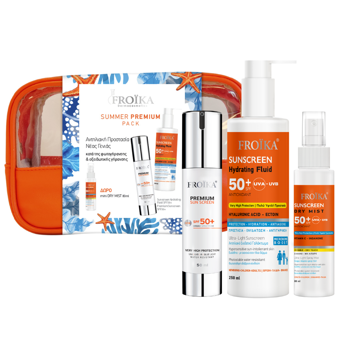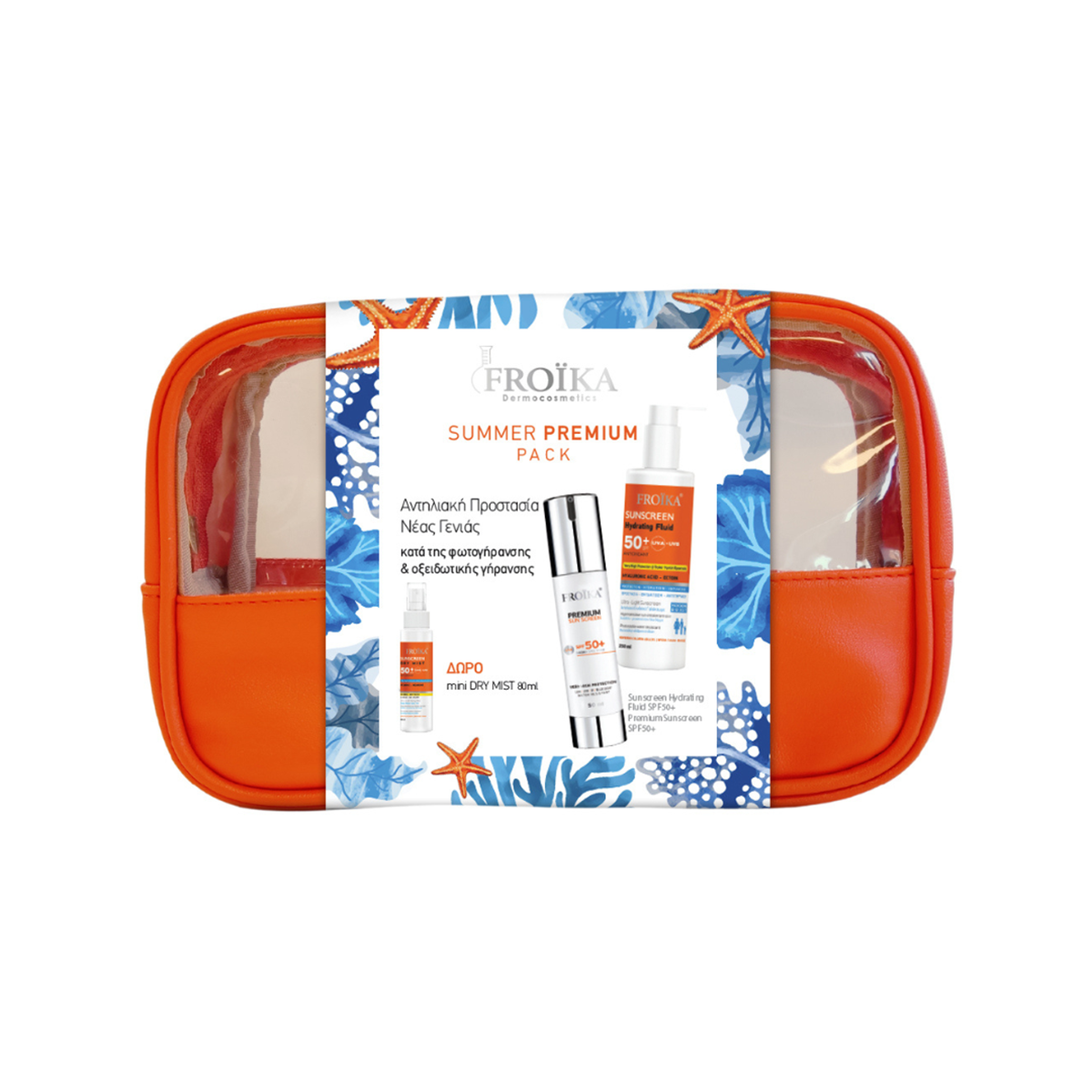 Το σετ περιποίησης Premium Summer Pack περιλαμβάνει αντηλιακό προσώπου Premium Sunscreen SPF50+ 50 ml και αντηλιακό γαλάκτωμα σώματος Sunscreen Hydrating Fluid SPF 50+ 250 ml για ολοκληρωμένη προστασία από τον ήλιο + ΔΩΡΟ αντηλιακό mist-λαδι σε ειδικό μέγεθος 80 ml & νεσεσέρ παραλίας.