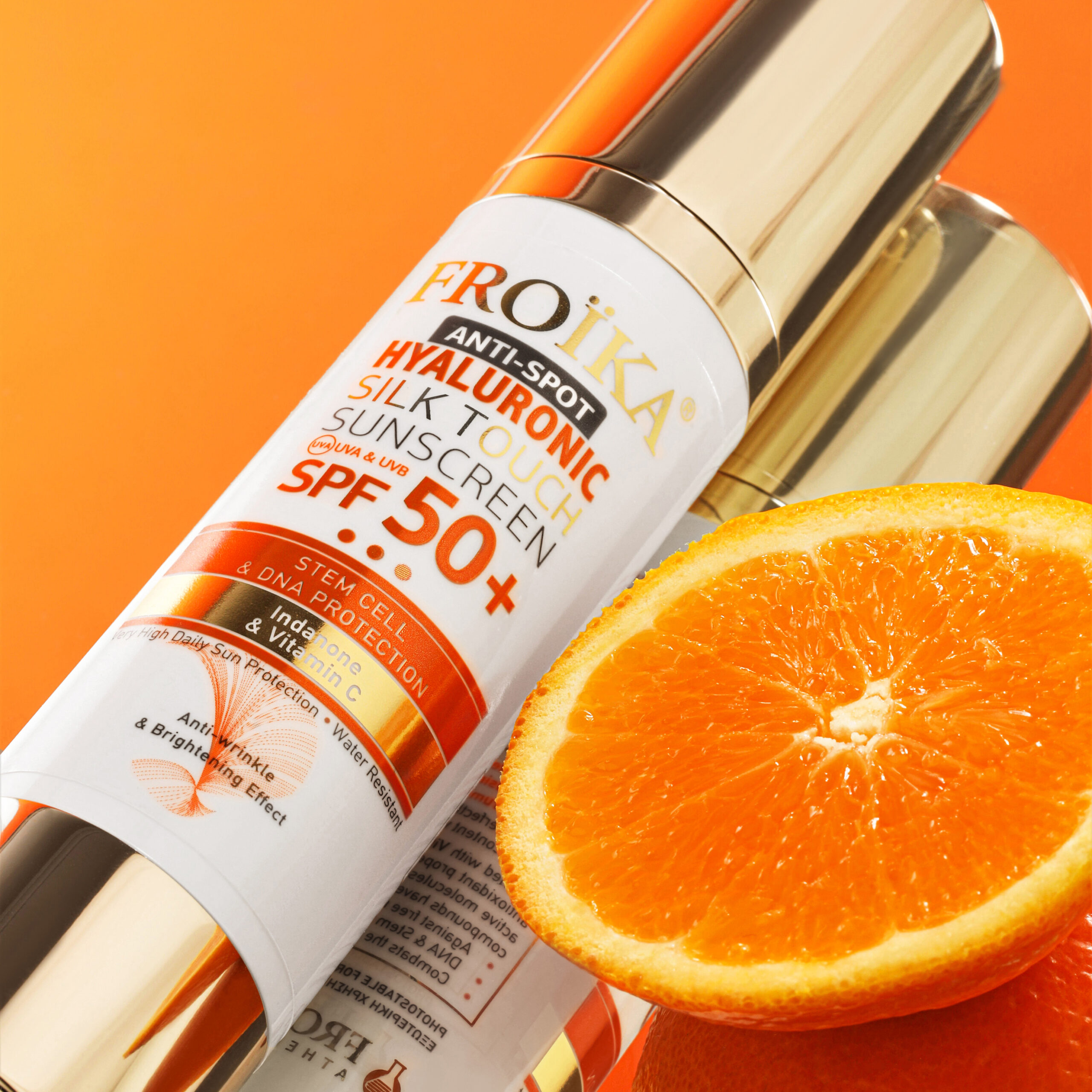 Το Froika Hyaluronic Silktouch Sunscreen Antispot 50+ είναι ένα νέο μοναδικό λευκαντικό αντιηλιακό το οποίο βασισμένο σε καινοτόμα τεχνολογία ελαστομερών 3ης γενιάς, αφήνει μια μεταξένια αίσθηση στο δέρμα και παρέχει πρωτοβάθμια αντιηλιακή προστασία ευρέος φάσματος UVA & UVB, ενώ σε δεύτερο στάδιο λόγω της ευεργετικής δράσης της Indanone και των υπόλοιπων αντιοξειδωτικών μορίων παρέχει πολυδύναμη προστασία εσωτερικά του δέρματος. Ενυδατώνει σε βάθος την επιδερμίδα λόγω του υαλουρονικού οξέος ενώ ταυτόχρονα έχει αντιρυτιδικό αποτέλεσμα αφού οι ρυτίδες, οι ατέλειες και τα σημάδια ακμής γίνονται λιγότερο ορατά.