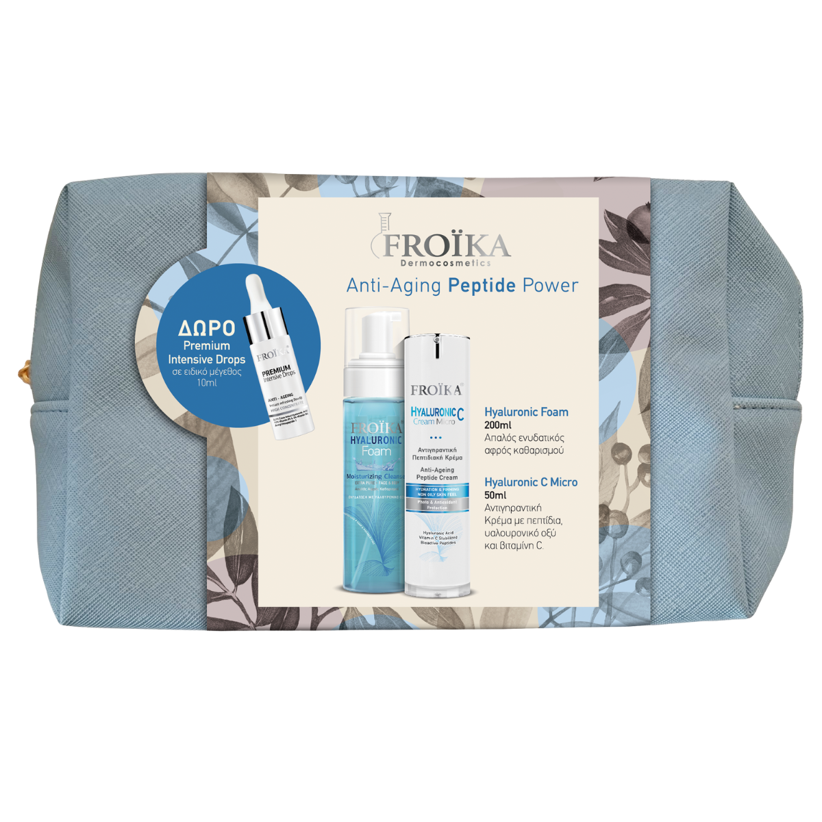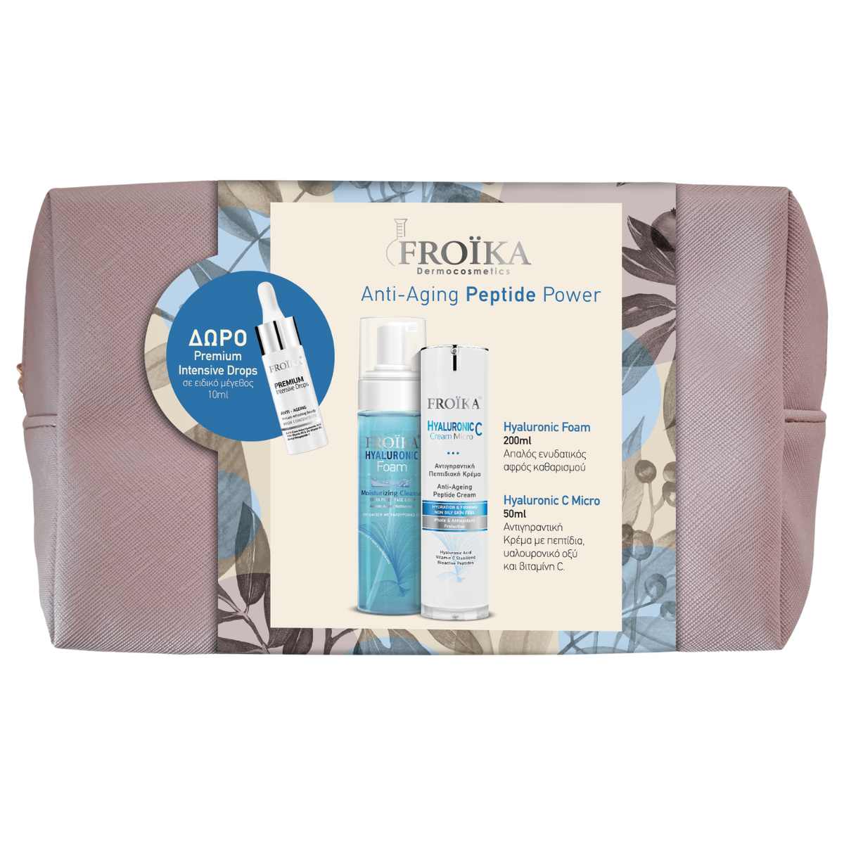 Το σετ περιποίησης Peptide Anti-aging Power περιλαμβάνει κρέμα προσώπου Hyaluronic C Micro 50 ml και αφρό καθαρισμού Hyaluronic Foam 200 ml για ολοκληρωμένη φροντίδα ενάντια στις πρώτες ρυτίδες + ΔΩΡΟ αντιγηραντικό serum σε ειδικό μέγεθος 10 ml & υπέροχο νεσεσέρ.