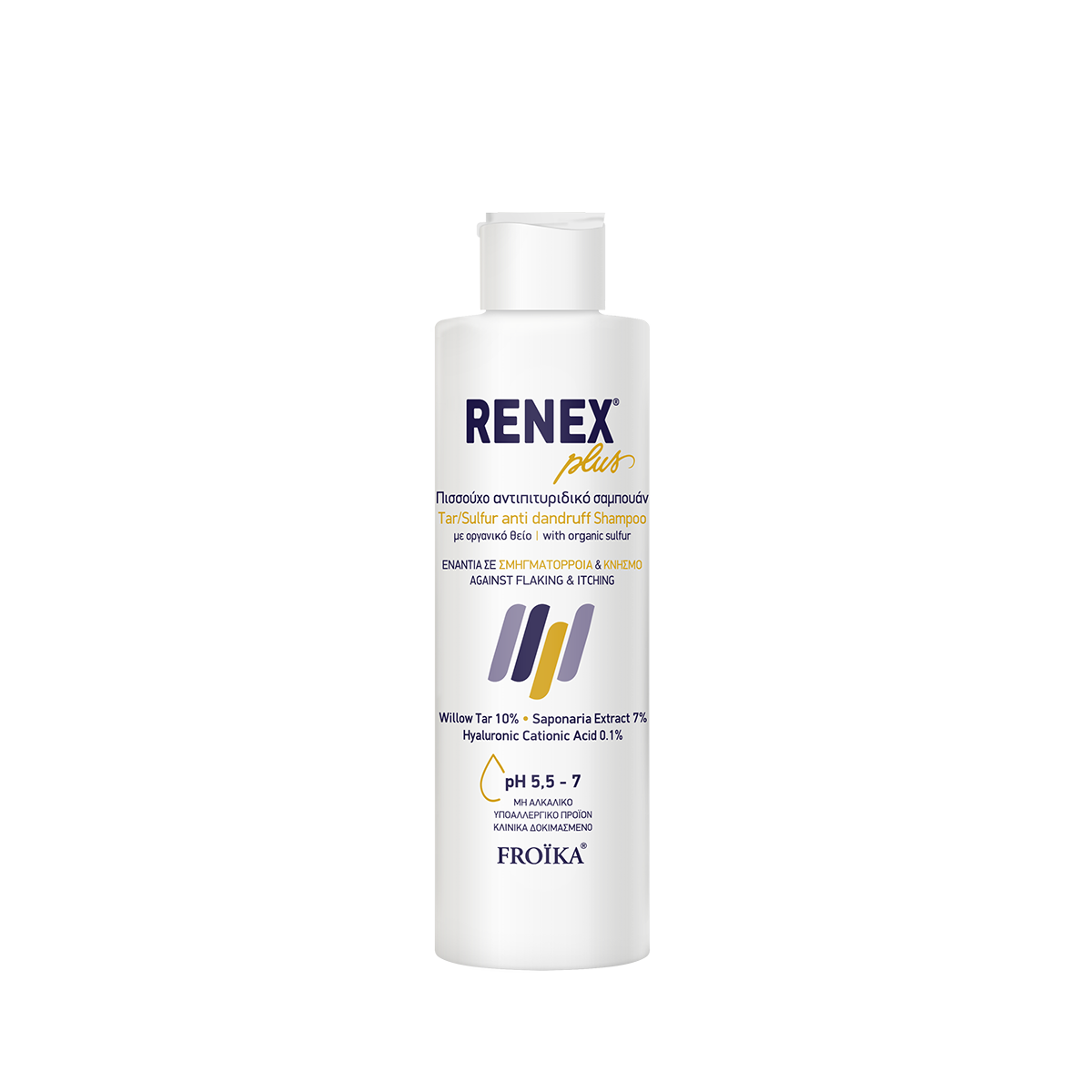 To RENEX- plus Shampoo είναι ένα αποτελεσματικό προϊόν το οποίο στοχεύει στην αντιμετώπιση προβλημάτων των μαλλιών όπως πιτυρίδα, σμηγματόρροια, κνησμός κλπ. Η ειδικά σχεδιασμένη σύνθεσή του με Willow Tar extract, θείο και κολλαγόνο παρέχει υγιή εμφάνιση στα μαλλιά, αφήνοντας τα λαμπερά και ευκολοχτένιστα.