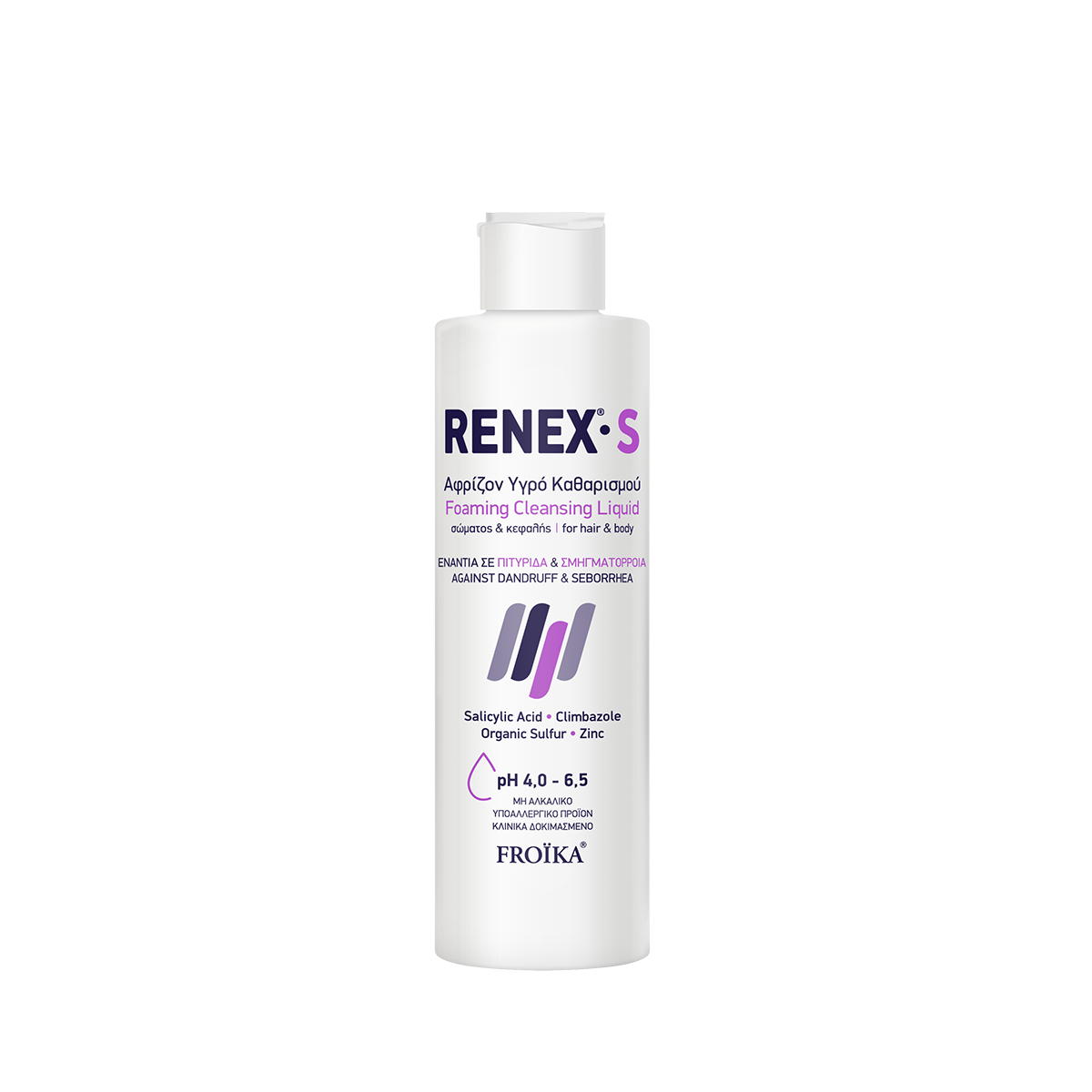 Το RENEX-S είναι ένα υποαλλεργικό, κλινικά ελεγμένο προϊόν που ρυθμίζει αποτελεσματικά τη σμηγματόρροια και καταπολεμά την πιτυρίδα ενώ παράλληλα αναζωογονεί, καθαρίζει και ανακουφίζει το δέρμα. Εμπλουτισμένο με SALICYLIC ACID, SULFUR & ZINC PYRITHION.