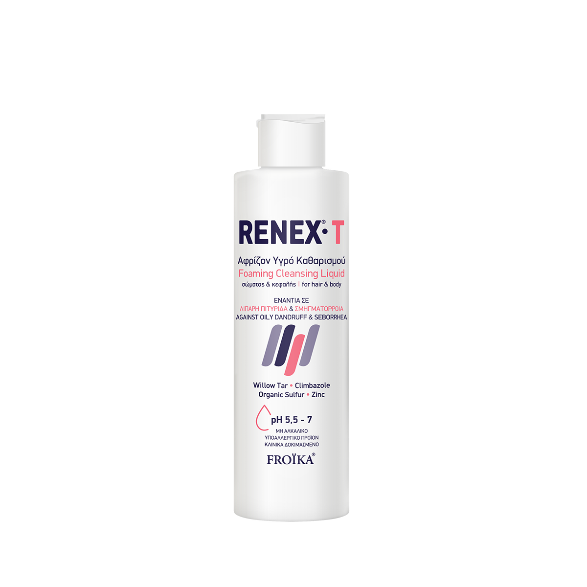Το RENEX- T είναι υποαλλεργικό, κλινικά ελεγμένο προϊόν, πολύ αποτελεσματικό στη ρύθμιση της λιπαρότητας του δέρματος. Εμπλουτισμένο με WILLOW TAR & Sulfur, προσφέρει ανακούφιση και αναζωογόνηση του δέρματος. Δημιουργεί πλούσιο και απαλό αφρό, αφήνοντας το δέρμα καθαρό και υγιές.